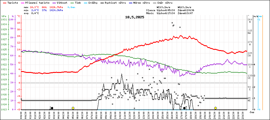 | Maximální teplota: | 14.3°C | v 16:55 |