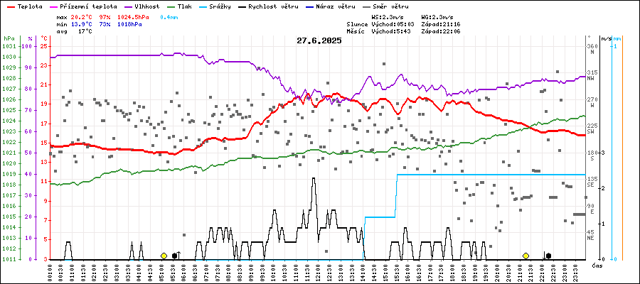 | Minimální teplota: | 13.9°C | v 05:35 |