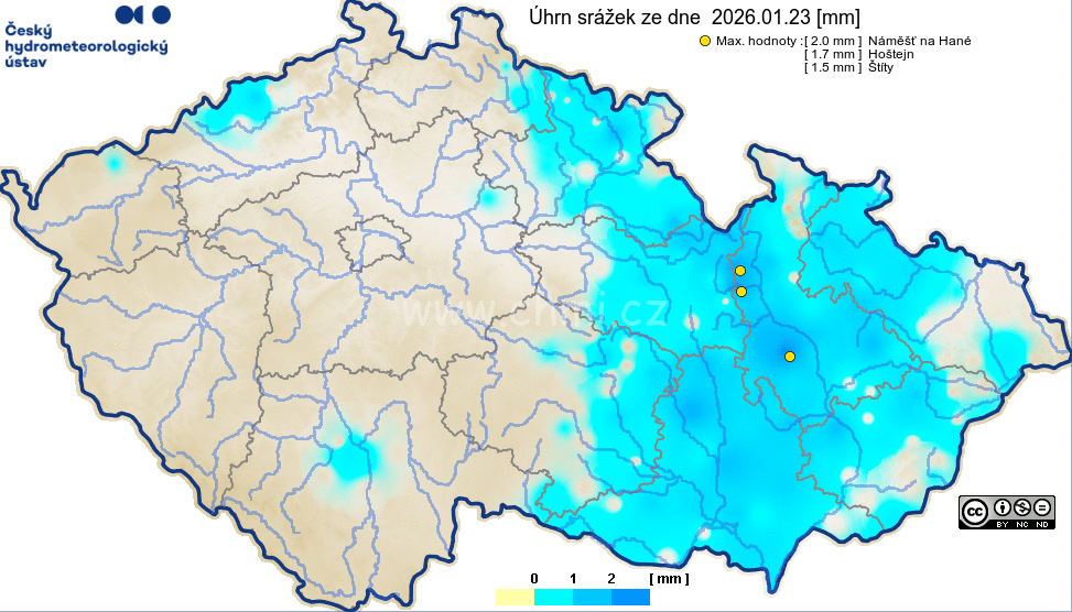 Srážky za předchozí den se přičítají do měsíčních statistik v odpoledních hodinách, aktualizace dat 1x za hodinu