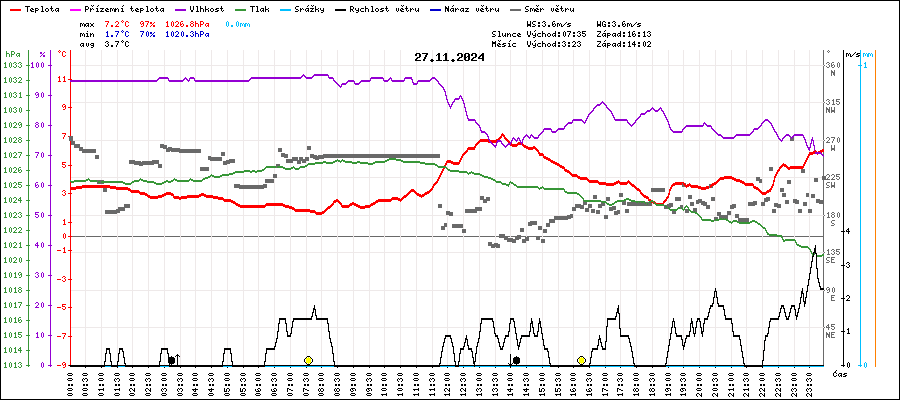 | Maximální teplota: | 7.2°C | v 13:45 |